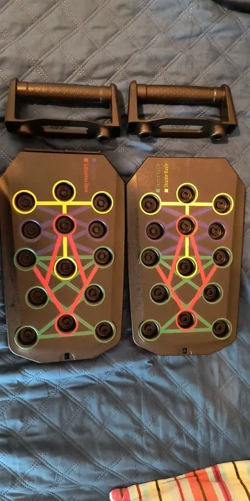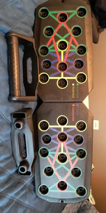The push-up training plate is a good purchase. Helps greatly in correct positioning to reach the desired muscles.